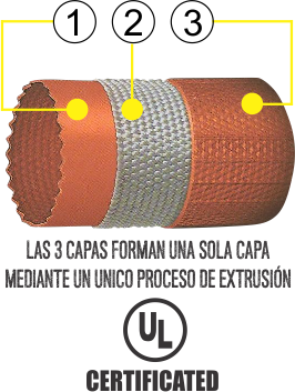 Las Mangueras de Nitrilo Contra Incendio GOMTEX cuentan con 3 capas que forman una sola capa medianet un proceso de extrusión, además de contar con la Certificación UL.